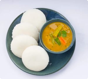 Idly is a popular South Indian vegetarian breakfast dish made from a fermented batter of rice and urad dal (black gram). The batter is poured into small molds and steamed, resulting in soft, fluffy, white cakes. Idly is light, easy to digest, and often served with coconut chutney, or sambar,